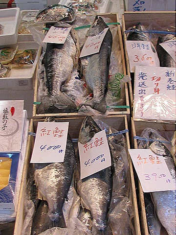 下面的照片就是築地漁市,這個漁市場其實和台灣的傳統市場差不多,只是大部份都是賣魚貨的攤子,從新鮮的到醃漬的都有。