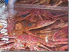 下面這張照片就是新鮮的帝王蟹,在日本只有北海道出產的這種長腳蟹,才被稱為是帝王蟹,肉質比較鮮甜,但其實有另外一種叫蜘蛛蟹的長腳蟹和帝王蟹的長得很像,不過價錢上差很多,肉質的鮮甜度上也就當然差了很多,聽說台灣有些不肖的餐廳會用蜘蛛蟹來混充帝王蟹來賣,賺取超額的利潤。