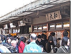 下面的這張照片就是築地屬一屬二的壽司店,排得是人山人海,隊伍轉了不知道幾折,連店家都需要派人手來維持秩序。日本人對這種排有長長人龍的店,有著超人般毅力及堅持,隊伍排得越長,日本人是越愛排,非吃/買到不可!所以聽說日本有些店在開張時,會請人在店門口排隊,以招攬客戶。當然囉!我們這些觀光客,沒有這種本地人的堅持,看到那長長的人龍,立刻打了退堂鼓,轉到附近其他隊伍長度中等的築地壽司店去嘗鮮,否則要跟這些堅忍不拔的日本人湊熱鬧,以這麼長的隊伍慢慢排,大約要等上至少兩小時,等輪到我時,可能吃中飯變成吃下午茶,另外一方面,以出國旅遊來說,在當地停留的時間是最寶貴的,把時間花在排隊上,真可說是得不償失!