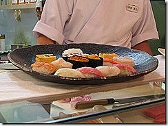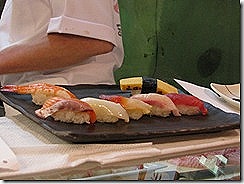 其實壽司是個講究很多細節的料理:食材要新鮮、米要用壽司米、米粒要煮得軟硬適中、醋飯要攪拌均勻、飯丸要捏的鬆緊適中、生魚片或其他食材要和飯丸完美結合…大抵上,你如果看過漫畫:將太的壽司,就會對這種料理有比較深入的瞭解。做得好的壽司和做不好的壽司,口感上真得是差很多,而你只要嘗過做得好吃的壽司後,應該以後都會對一般的迴轉壽司不屑一顧,因為口感真得是差很多!不過這兩者的價錢也是差很多,要口袋中的四個小朋友夠多,才敢去打牙祭,但是這邊在築地的價格,跟台灣比起來,大概便宜了快要一半,這邊一個有著12個握壽司的綜合握壽司套餐,大約新台幣千元上下。