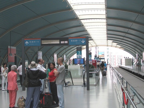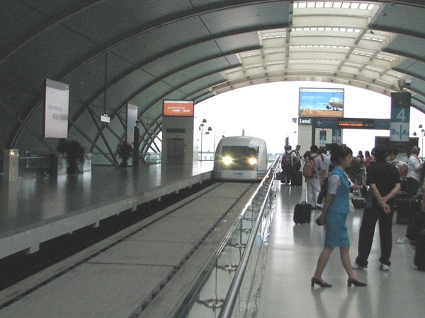 下面就是上海浦東機場的磁浮列車,這磁浮列車可是跑得比我們的高鐵還快呢!至於我們的高鐵為什麼會跑這麼慢呢?其中一個原因,是因為台灣的政治及其他非專業的考量,設立了太多的高鐵站,以致台灣的高鐵跑不快……